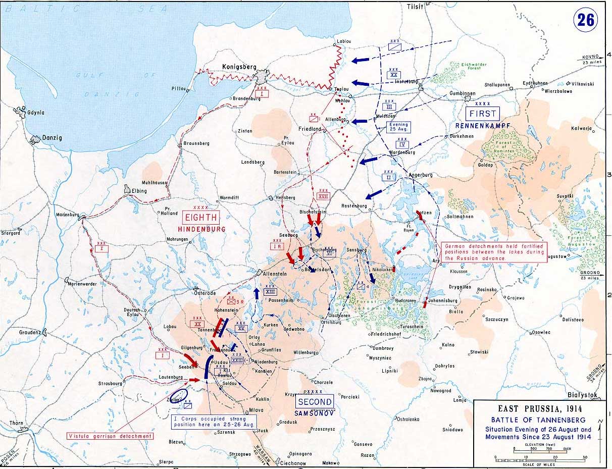 The initial engagement occurred on August 20, with the Germans achieving a swift tactical victory. However, their troops were subsequently overextended and withdrew. The decisive battle took place between August 26 and 30. The Germans demonstrated superior maneuverability, while the Russians faced challenges in coordinating their troops. With enhanced intelligence and effective leadership, the Germans decisively defeated the Russians. The German forces captured 92,000 Russian troops and suffered a loss of 78,000. Additionally, the Russians lost 350 large guns. Consequently, the Russian army was compelled to retreat from a significant portion of Prussia. However, the German military, lacking sufficient reinforcements, was unable to capitalize on their initial victory.